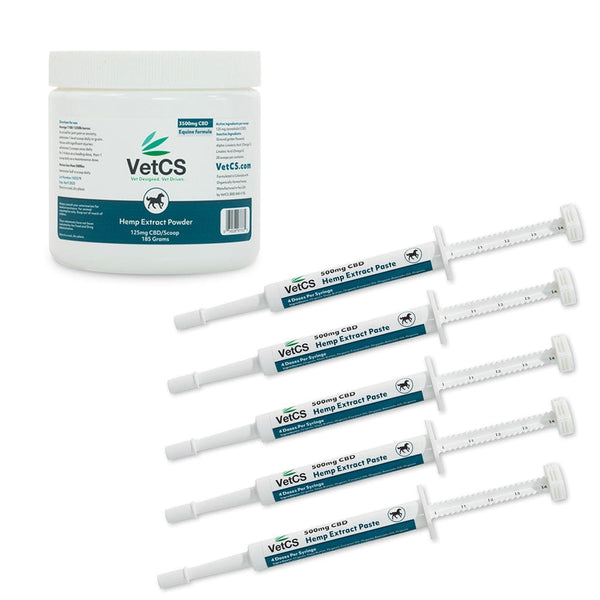 This discounted option (10% savings) is designed for acute conditions that require higher daily doses of CBD by utilizing our VetCS CBD Paste until a maintenance dose of daily CBD powder can be given. Pack includes: 5 tubes of 500mg CBD Horse Paste and 1 container of 3,500mg CBD Horse Powder (28 scoops). Â