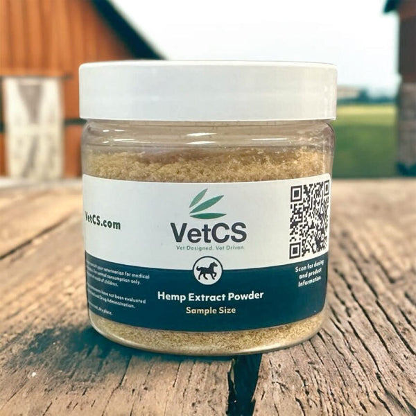 VetCS hemp extract powder sample size is a palatable option for easy daily dosing. Our equine veterinarian designed formulation provides a stabilized ground flaxseed base which is also a great source of Omega 3 and Omega 6 essential fatty acids. The perfect addition to your horses daily routine to help lower anxiety, reduce inflammation, improve mobility, and promote overall comfort. Simply add to grain and horses love the flavor!