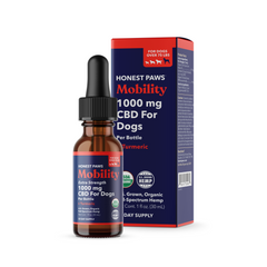Honest Paws Mobility Full-Spectrum Hemp (with naturally occurring CBD), is a product designed specifically for dogs to support their joint health and improve mobility. Our easy-to-use CBD tincture is formulated to cater to the everyday needs of your dog. Our product is crafted to help with stiff joints and may help with the discomfort associated with normal daily exercise and activity, enabling your dog to move with greater ease. Infused with the benefits of CBD and a touch of turmeric, our formula aims to improve the function of your dog’s joints and connective tissue. We believe that not only will your dog experience the potential advantages, but they’ll also appreciate the taste.