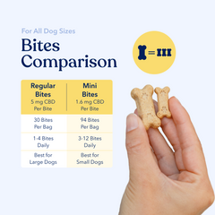 Mini Bites – Smaller crunchy chewables in a 90-count package with 1.6 mg of CBD each. Our 90-count package is perfect for gradual support in servings of just 3-12 bites based on dog size.