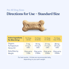 Standard Bites – Designed for dogs with 5mg of CBD each. Our 30-count package is perfect for straightforward servings in just 1-4 bites based on dog size.